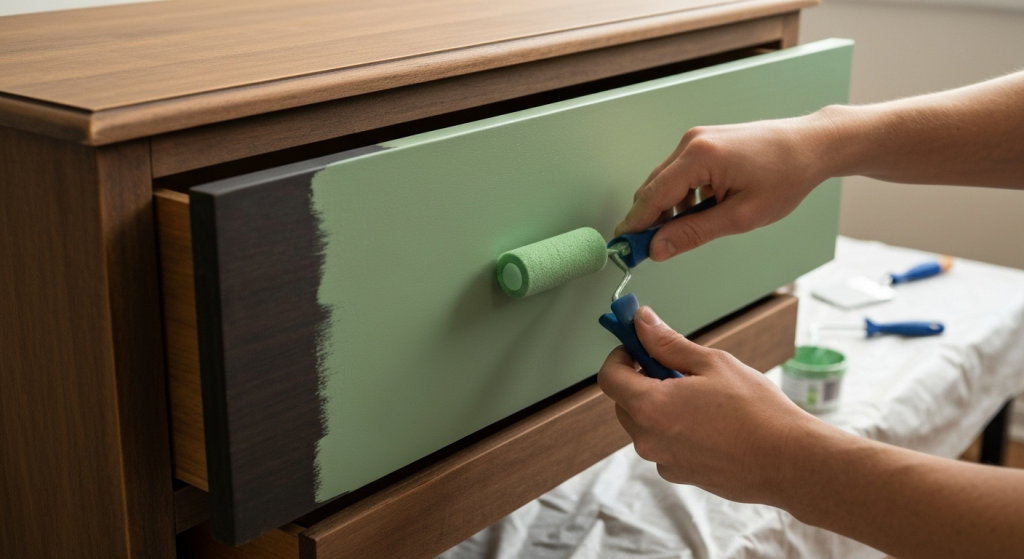 4. Apply the First Coat of Paint: Using your brush for the corners and details and your foam roller for flat surfaces, apply a thin, even coat of your chosen paint. Don’t try to get full coverage in one go. A thick coat will lead to drips and a longer drying time.