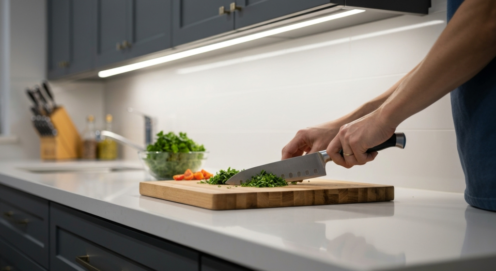 - In the Kitchen: Under-cabinet lighting is a game-changer. It illuminates your countertops directly, making food prep safer and easier without casting shadows from the overhead lights.