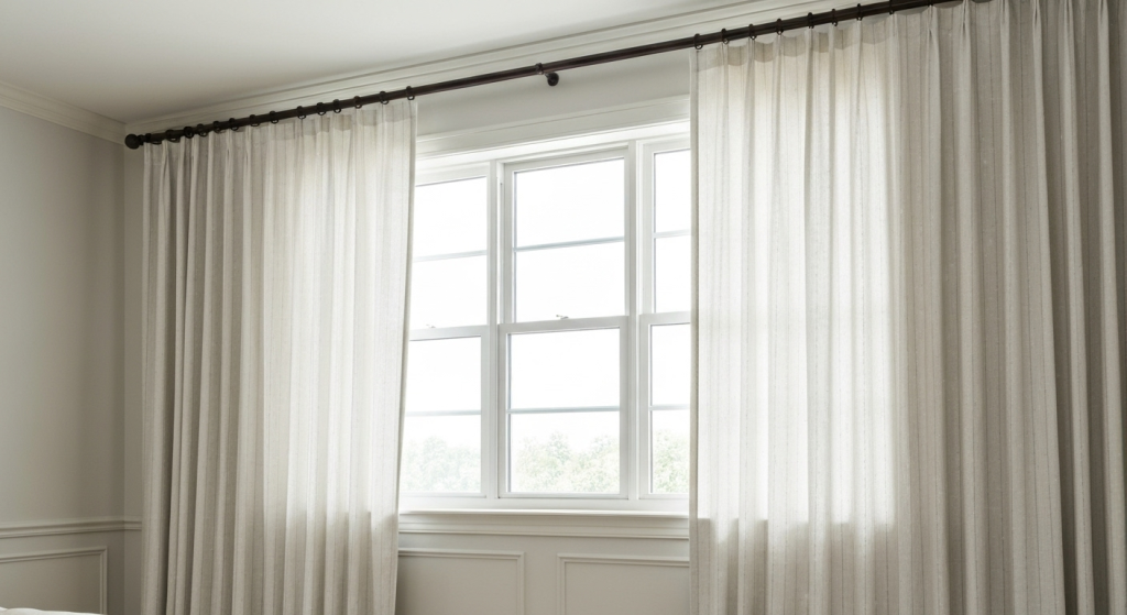 - Fabric: Opt for lightweight fabrics like linen, cotton, or sheer voiles. These materials feel airy and don’t weigh down the room. Heavy, thick drapes like velvet can feel bulky and make the space seem smaller.